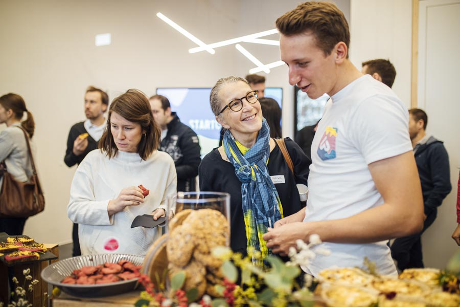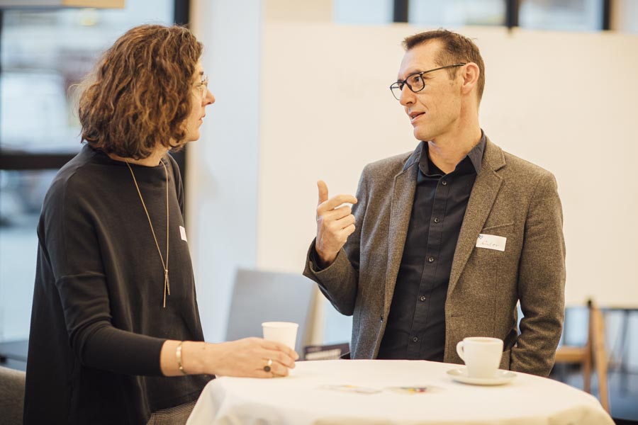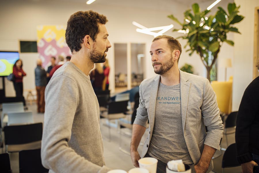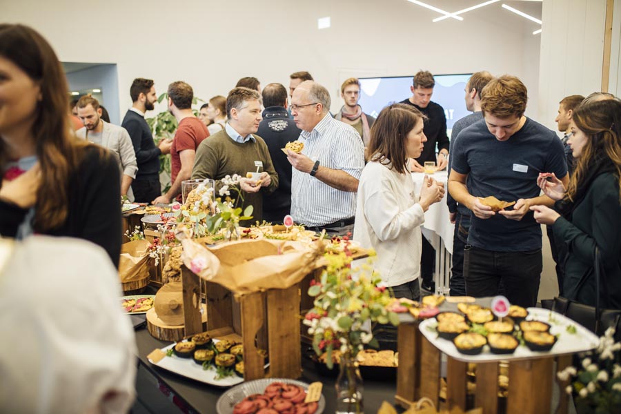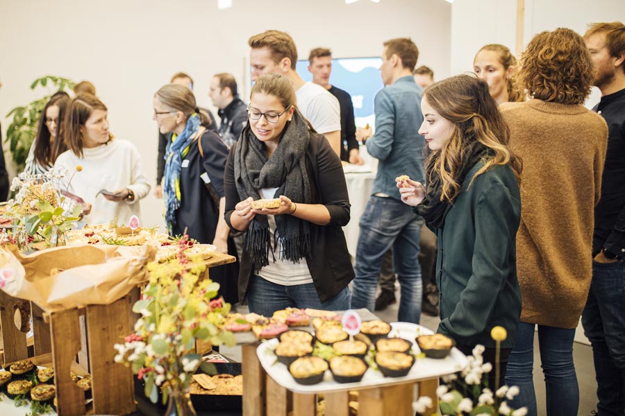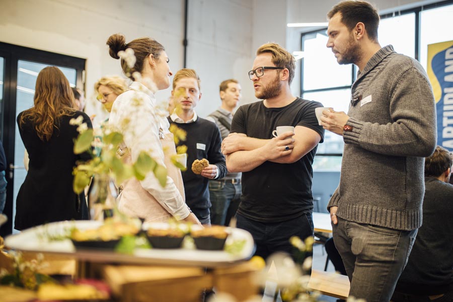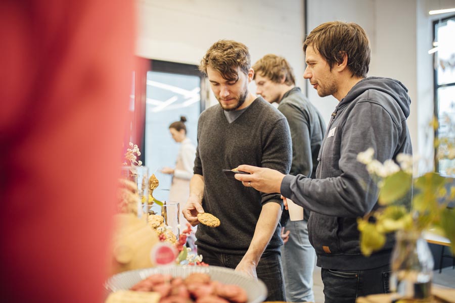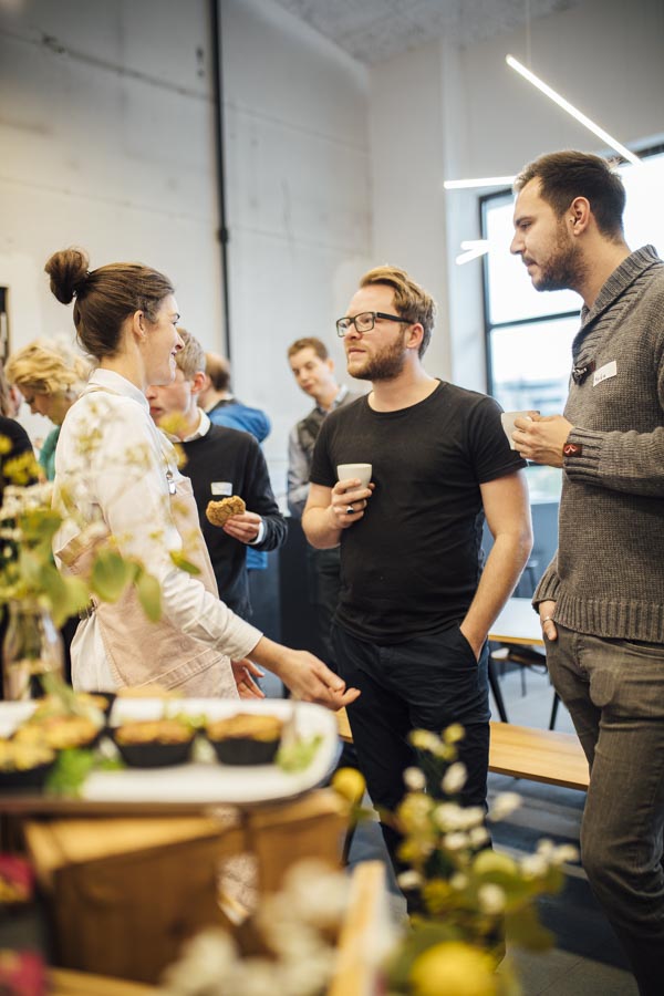 Bei frischen Zimtschnecken und Kaffee ging es anschließend zum Austauschen und Netzwerken beim gemeinsamen Frühstück. Ein liebevoll angerichtetes Buffett von der Begeisterei erwartete die Besucher. Mit Kaffee und frischen Snacks bestückt, wurde das Gehörte reflektiert, überlegt, neue Ideen geschmiedet und nebenbei die Räumlichkeiten der Postgarage – genauer gesagt des Postgarage Innovation Hubs besichtigt.